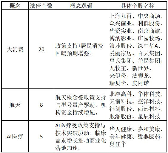从概念特征来看,今日涨停板个股中,大消费、航天、AI医疗的个股最多。