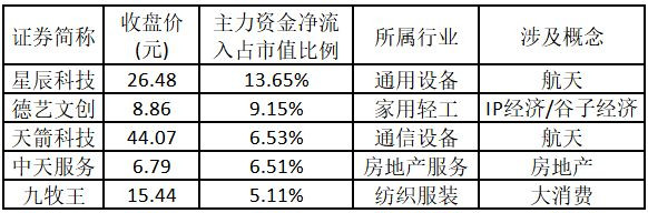 主力资金净流入金额占市值比例排名前5的个股分别为星辰科技、德艺文创、天箭科技、中天服务、九牧王。
