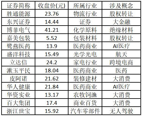 涨停板个股中,股价创出近一年新高的个股有13只(不包括创出历史新高的个股),包括胜通能源、东兴证券、博菲电气、嘉美包装、鹭燕医药、盛洋科技、立达信、漱玉平民、皮阿诺、华人健康、华资实业、百大集团、浙江世宝,具体如下表所示。